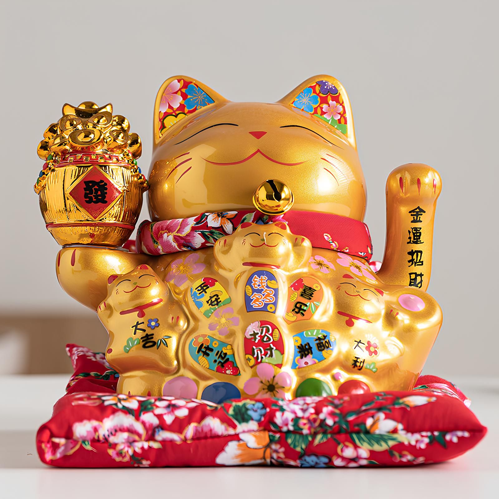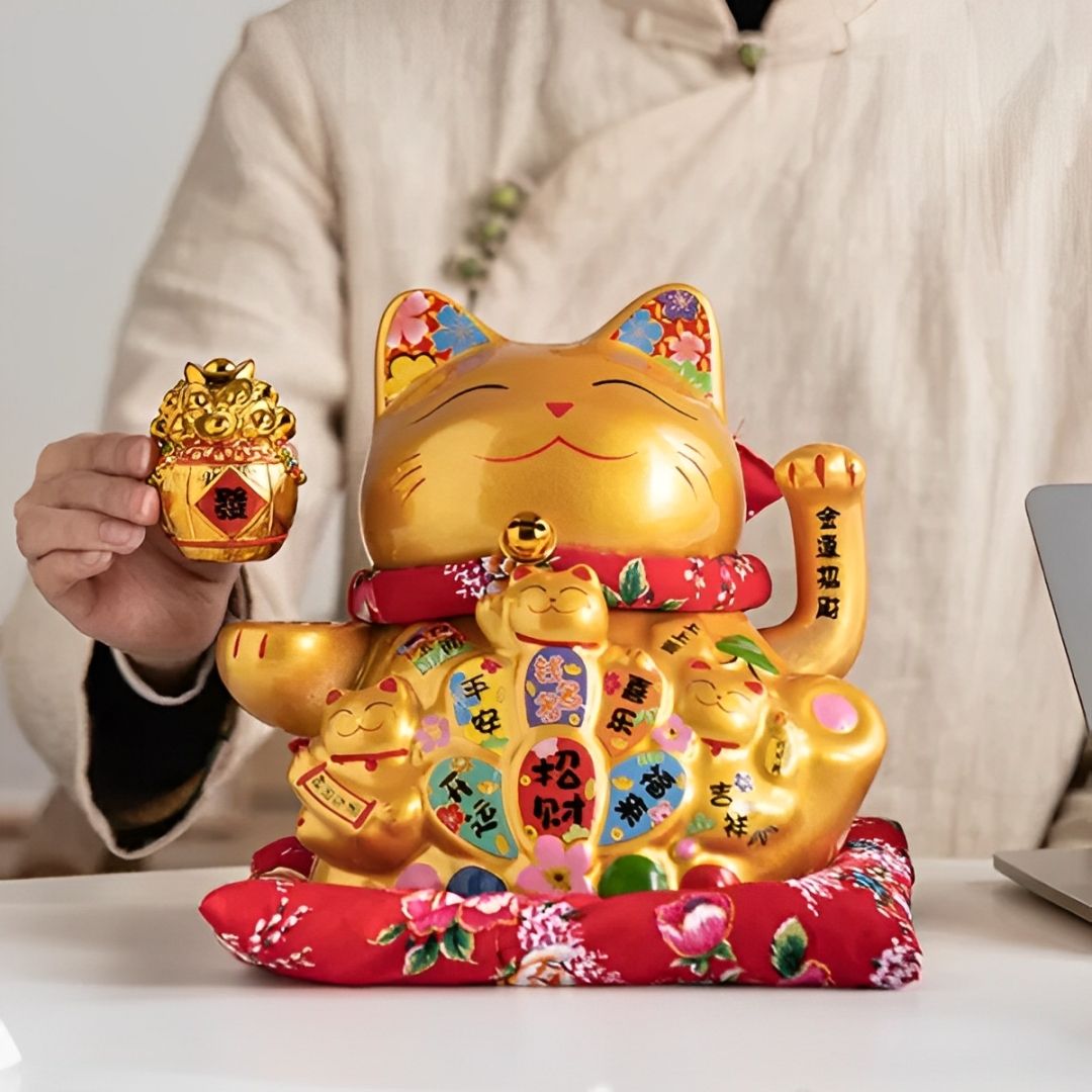 Mèo thường được trang trí bởi các vật dụng tượng trưng cho tài lộc, may mắn như đồng tiền, chiếc vòng gắn chuông quanh cổ…